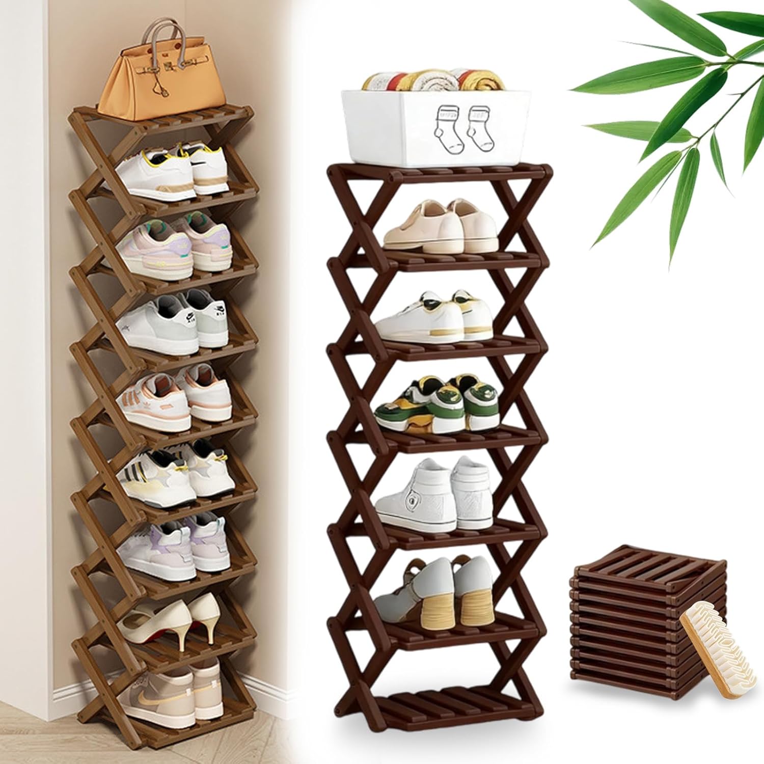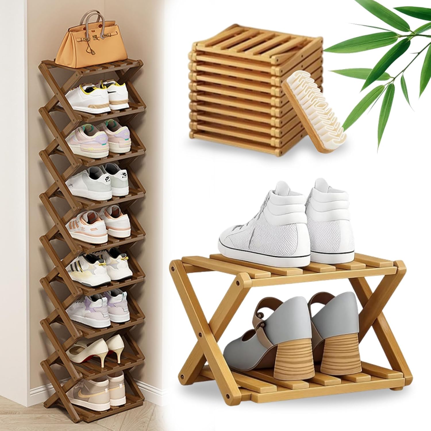 Why Choose This No-Assembly Bamboo Rack? 1. Unfolds and locks in seconds, no tools needed 2. 25cm wide profile fits anywhere 3. Durable, smooth finish, and visually warm 4. For shoes, books, plants, and more 5. Stores as thin as a yoga mat 6. X-frame design supports 15kg per shelf 7. Wipe and go maintenance Specifications: Product Name: Folding Multi-Tier Organizer Rack Material: Nan Bamboo Dimensions: Width 9.8 in / 25 cm (varies by tier/height option) Weight: N/A Functions: Vertical tiered storage; fold-and-lock setup; folds flat for storage Use Scenarios: Entryway, closet, apartment, hallway, bedroom, bathroom, pantry Care: Wipe clean with a damp cloth Tiers: 2/3/4/5/6/7/8/9 fixed shelves Weight Capacity: 33 lbs per tier / 15 kg per tier Assembly Required: None – unfolds instantly Color Options: Brown, Natural Package Include: 1 * No-Assembly Bamboo Rack 1 * Shoe Brush Note: Please allow slight dimens error due to manual measurement.Thank you for your understanding! Due to different monitors and different lighting, the picture may not show the actual color of the item. Our Promise to You: We value every customer response and offer friendly customer service. We sincerely hope you could enjoy the purchase and enjoy your life carry with our premium products