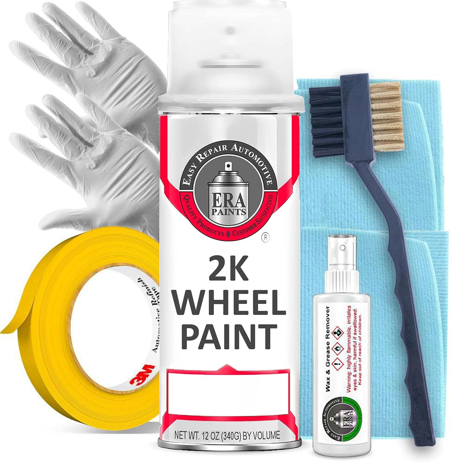 ERA Paints was founded in 2016 to bring the finest quality auto touch up paint products to the DIY auto market. And our aerosol 2K Wheel Paint does not disappoint!We offer high quality premium 2K aerosol spray paints which adhere so well that they can be sprayed right over rust!How many cans does it take to spray all four wheels?Two 2k High Temp Wheel Spray paint cans should be enough to apply 2-3 coats on each wheel.Our wheel paint resists chipping flaking fading and has superior chemical protection against brake cleaner lacquer thinner acetone brake fluid etc.Our spray paint is not typical rattle can paint: it is formulated as a 2K paint - which means a catalyst is introduced into the paint at application which creates a chemical reaction that causes the paint to quickly cure with a very hard surface.How do I prep my wheels for painting?Failing to prep is prepping to fail so we at ERA always emphasize the significance of prep efforts. Wheels need a thorough cleaning with a wire brush and warm water and dish soap detergent. Then degreaser needs to be applied to remove any impurities and oil/grease. The next step is to tape up your wheels to prevent oversprayOnce your prep is done it�s time to paint How do I use the 2k High temp spray paint?Introduce the catalyst into the paint. Shake the can vigorously and spray 1 or 2 coats. Note that pot life (usable spray time) is about 8 hoursOnce fully cured you won�t believe how your wheels pop with outstanding shine and durabilityProudly Made in USA with all American materials. Keeping jobs in America!For safety reasons wear a NIOSH approved respirator breathing mask during painting to avoid inhaling any harmful chemicals.Our prep kits include everything needed to paint your wheels including quality 3M masking tape - just need to add warm water and detergent!