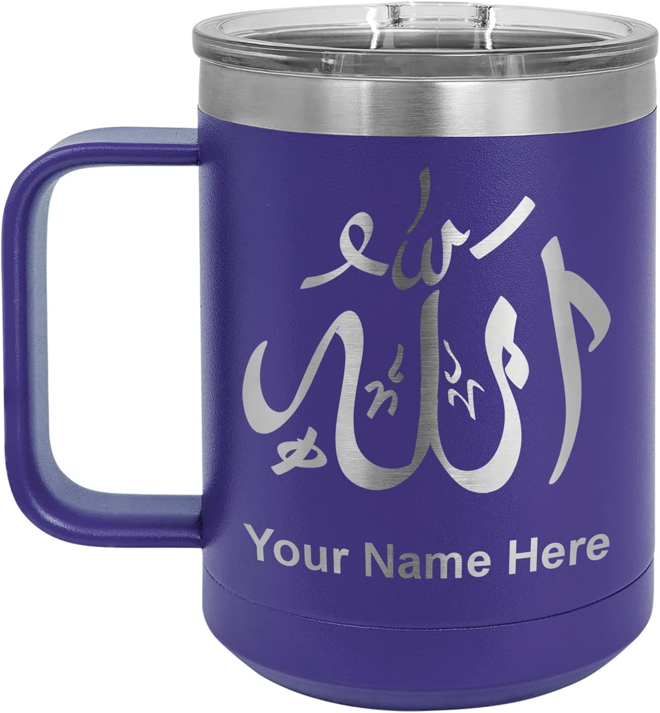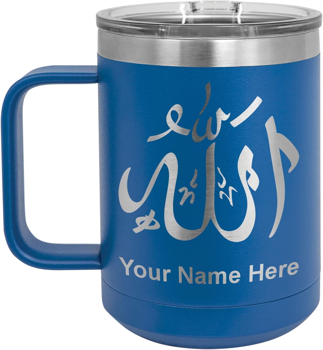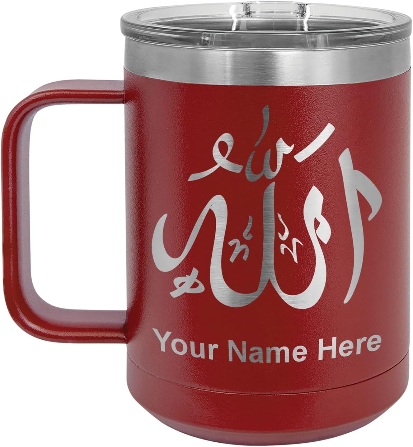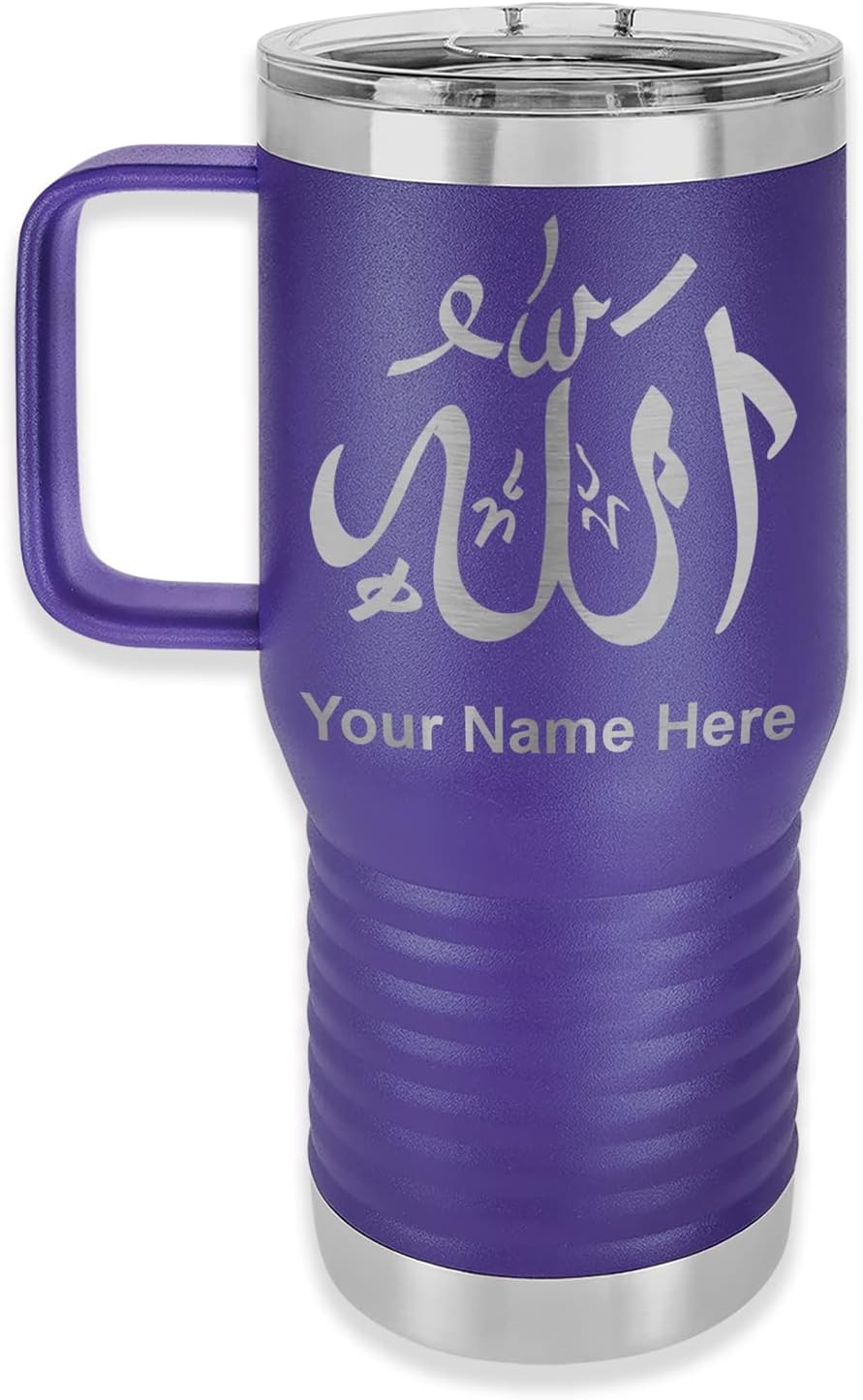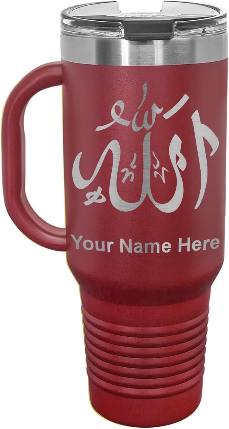 LaserGram 40 ounce Travel Mug with Handle that is laser engraved with the image that you see in the photo. Your own personalized text will be laser engraved below the image. Features double-walled stainless steel vacuum insulation with a clear lid. Click the "Customize Now" button to begin customizing your mug.
