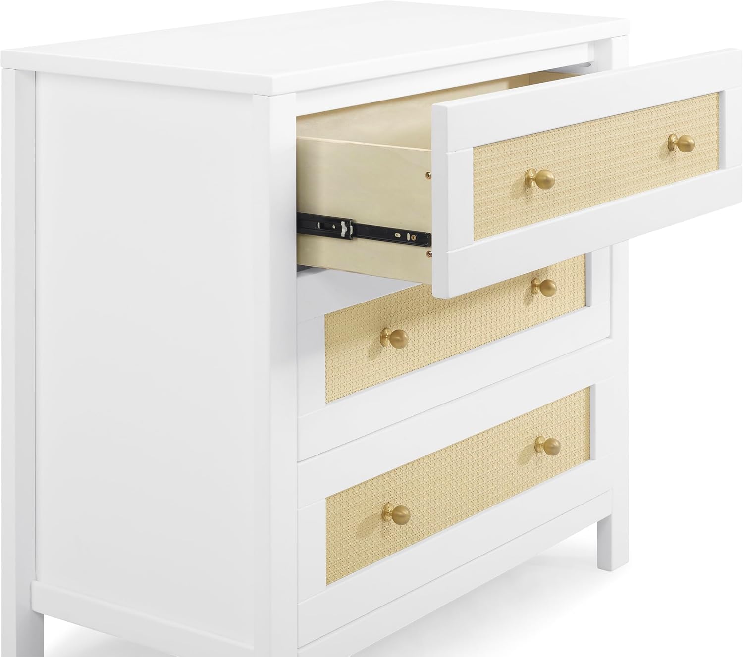 The Theo 3 Drawer Dresser with Changing Top by Simmons Kids gives a modern-meets-timeless feel with airy, natural-colored cane drawer fronts. This spacious storage piece serves as a sturdy changing table too, with the included changing topper (changing pad sold separately). When your child grows, just remove the topper, it easily transitions into a stand-alone dresser. This dresser also features a durable construction made from sustainable woods like New Zealand pine and interlocking drawers that only allow one drawer to be opened at any time for your child’s safety. Available in Bianca White and Ebony. Pair this dresser with the Theo 6-in-1 Convertible Crib to complete your space.All Simmons Kids dressers and chests are UL Stability Verified, tested to ASTM F2057 Furniture Safety Standard, the voluntary industry tip over standard for dressers. For your children's safety, only purchase dressers that comply with this standard. For additional security, Simmons Kids strongly recommends that all dressers in your home be anchored; all Simmons Kids dressers include a wall anchor. To learn how to properly secure your dresser, please see the product assembly instructions or visit our website.