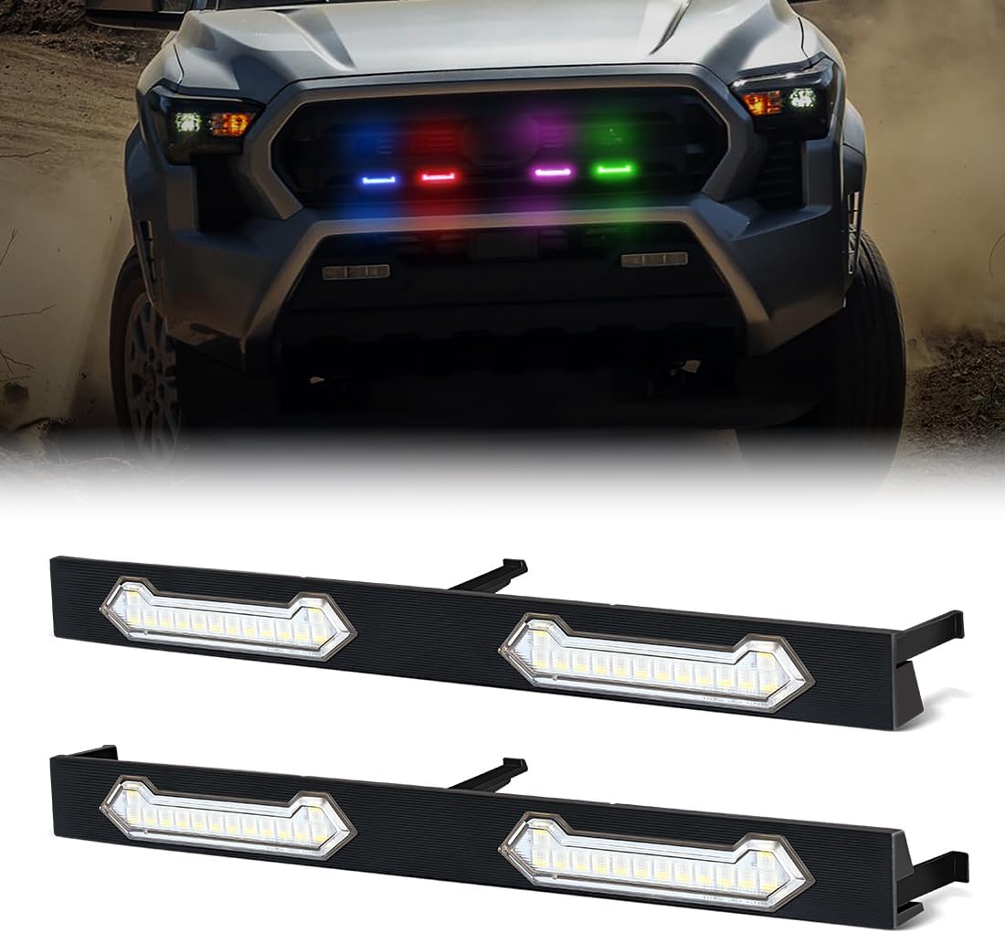 VGETTING Smoked Lens LED Grille Light For Toyota Tacoma SR/SR5 2024-2026 4PCS Amber Grill Lights Compatible Models: Only Fit for Toyota Tacoma SR/SR5 2024-2026 (Not for TRD Sport/Off-Road/Pre Runner/Pro/Trailhunter/Limited model, grille hole is different) Feature: Bright grille lights add to the cool and unique look of the car. High-quality materials and waterproof design, more sturdy and durable. Any combination of light modules to show your personality. Make it easy to recognize your vehicle in bad conditions and increase driving safety. It only takes 15 minutes to finish installation. Plug & play, no drilling required. Contact seller if you need help. Installation Step: 1. Attach the grille light to the hole. Allow the clips to secure to the grille seams. 2. Connect the two lights to the 2-in-1 harness. Wiring Method A: Connect the black wire to the negative terminal and the red wire to the fuse plug, and wrap it with tape to prevent it from falling off. Then plug into the ACC box. (Note the amperage of the fuse) Wiring Method B: Locate the wire harness on the right side of the cabin. The black wire connects to the thick white wire (negative) and the red wire connects to the thin white wire (positive). Secure it with electrical tape. Package Included: 2 X LED Grille Lights 1 X 2 in 1 Wire Harness 1 X Fuse Plug