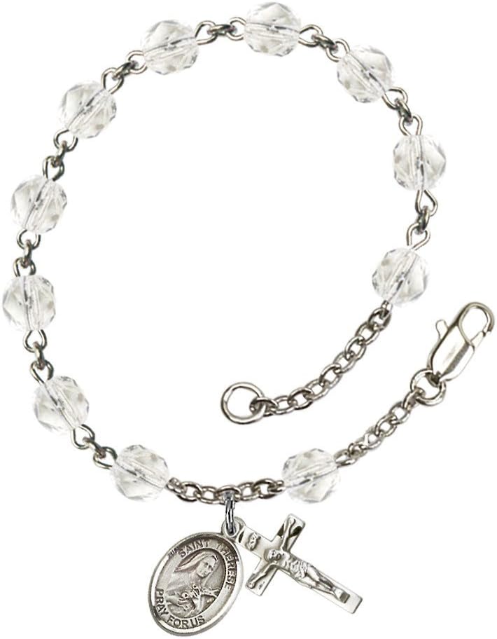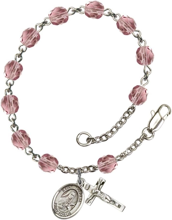 Available with bead color varieties for every birth month and birthstone.Silver Plate Rosary Bracelet 6mm Fire Polished Beads, Crucifix Size 5/8 x 1/4, St. Therese of Lisieux medal charmEach Rosary is presented in a deluxe velvet gift box.All Bliss products are 100% handmade in the United States at every stage of production, and come with a lifetime guarantee.