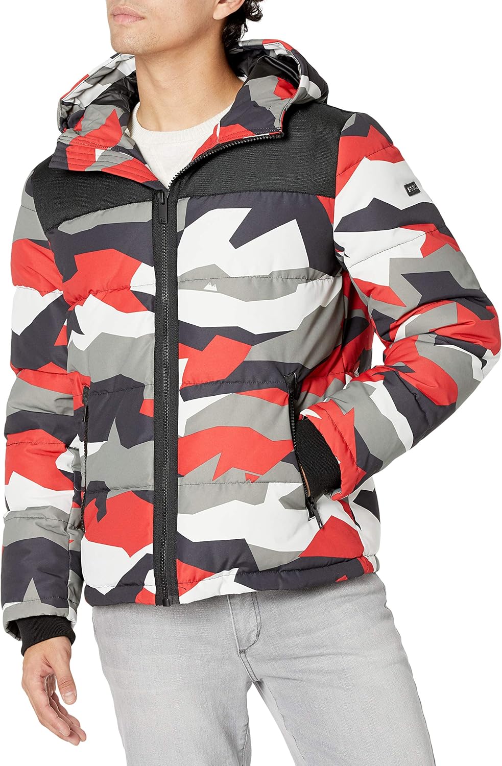 Water resistant mixed media puffer jacket in arctic cloth with polyester shoulder panels, center front zipper closure, adjustable drawstring hood, rib knit storm cuffs for added warmth, DKNY metal plate logo on left sleeve, two lower welt zipper pockets and one interior welt zipper pocket.