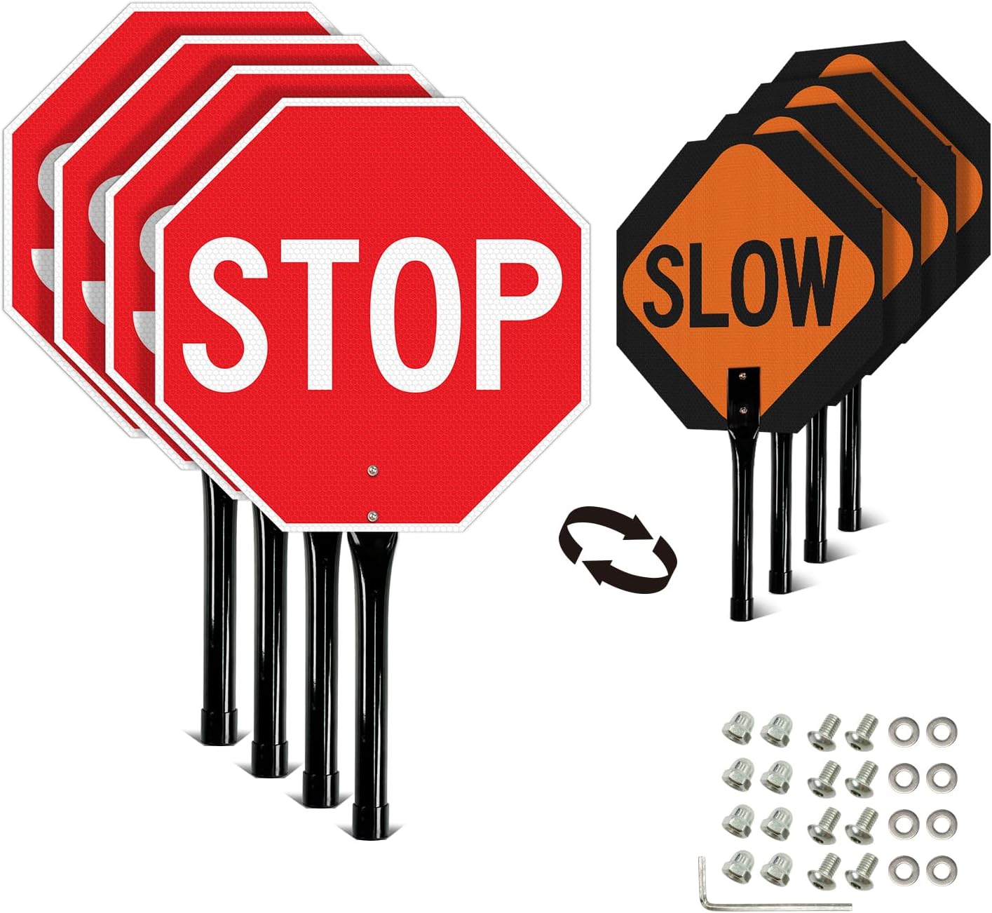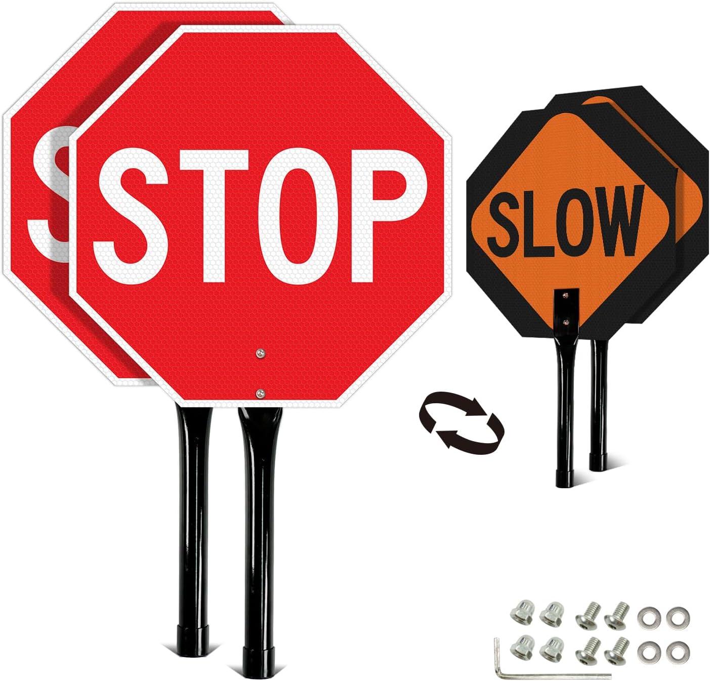 A handheld stop sign with a handle used by crossing guards functions as both a stop and slow signal.