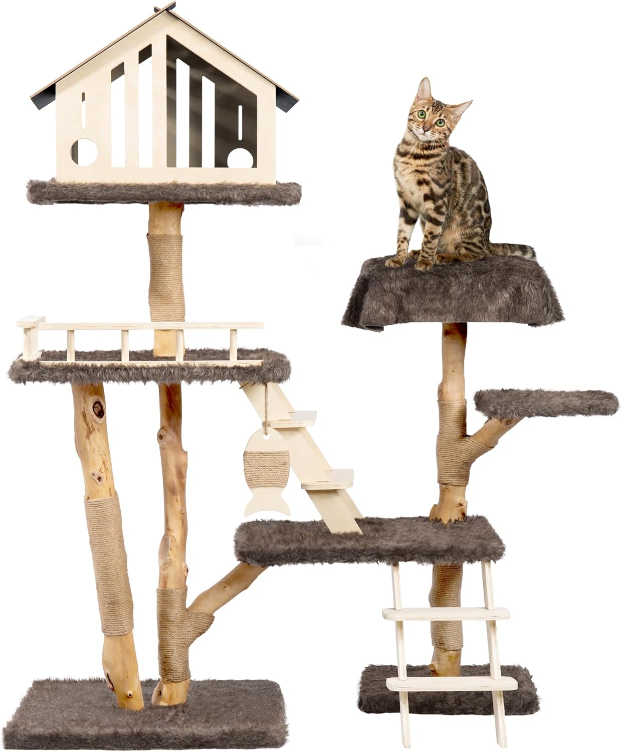 KAMABOKO 69”H Tall Wood Cat Tree, Large Cat Tower Multi-Level Platforms with Sisal Scratching Posts, Cat Condo for Large Cats 20 lbs Heavy Duty (69” H Wood Brown)