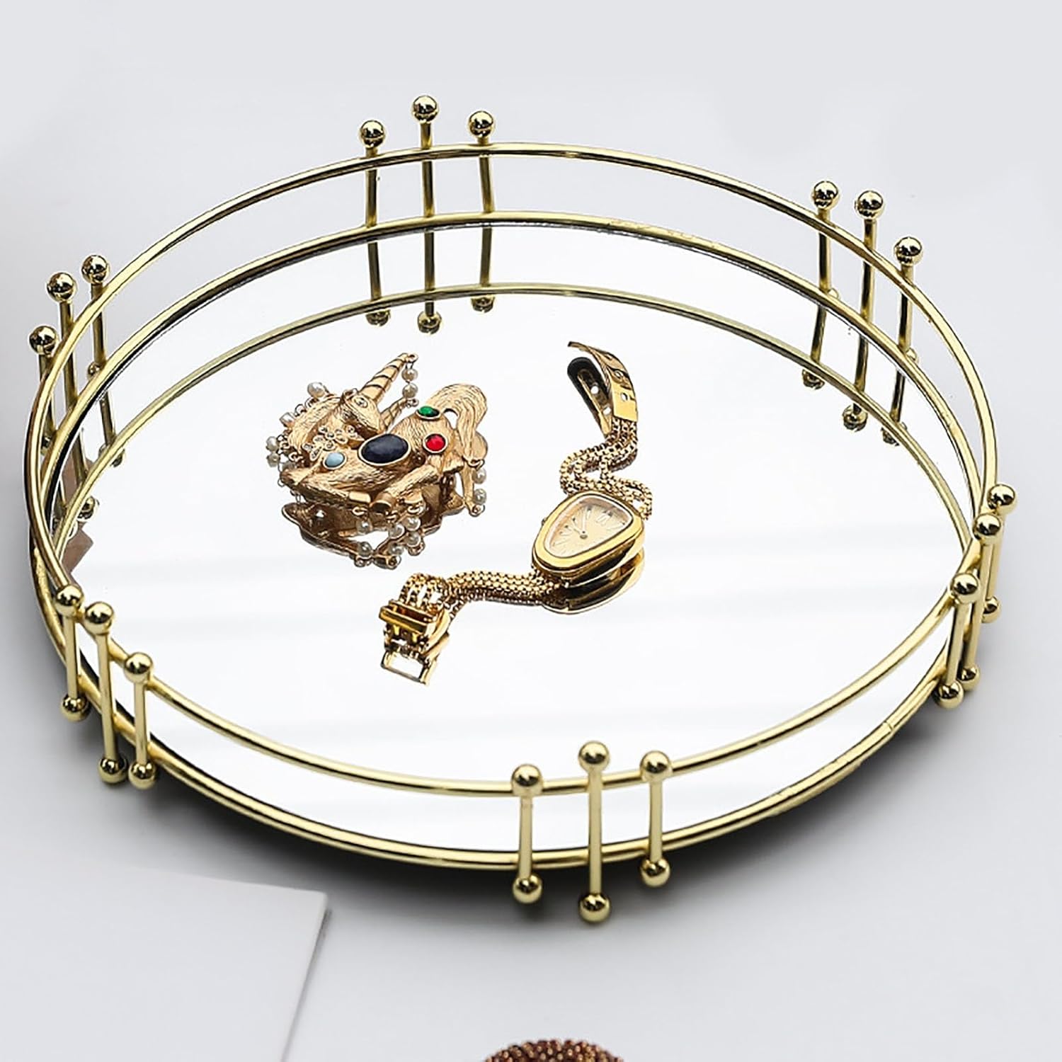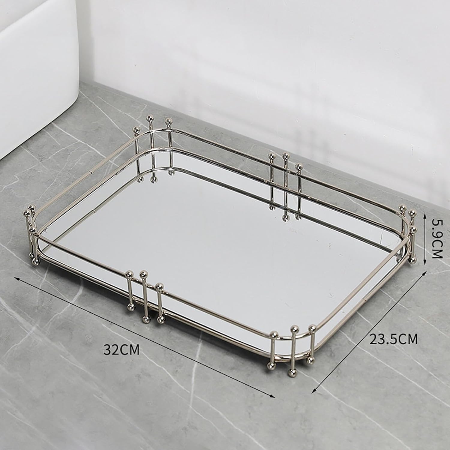 FEATURE - This mirrored tray features golden accents. The mirror on top, made from metal and acrylic glass, gives it a strong texture, overall toughness.- The gold glass tray; mirror serving tray is easy to maintain and offers a chic stylish way to keep your stuff organized while being a perfect choice for home decoration.- You can serve food and drinks, breakfast in bed, and store and organize all of your daily essentials. Decorative glass tray can be used to serve & display at weddings, baby showers, birthdays, and holidays! Mirror glass vanity tray; makeup tray.- The decorative perfume organizer tray is convenient for storing jewelry, perfume, cosmetics, cups and other daily necessities. Can be used as a wine serving tray; alcohol tray; or food serving tray.Specification:Material: Iron, GlassSize Chart:as shownPackage Includes:2 Decorative Mirror TrayNote:Please allow slightly errors due to manual measurement and different monitors.